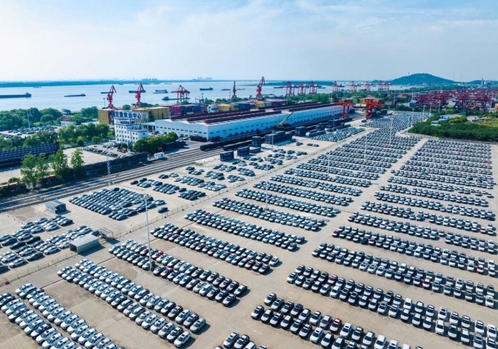 5月14日,正在安徽省芜湖港朱家桥港区船埠,划一陈列的汽车期待拆船出口海外。(无人机照片)。发(肖本祥摄)。